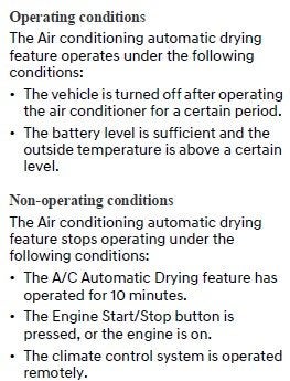 There is a feature called AC autodry that runs the interior fan for 10 minutes, 30 minutes after the car is shut off, IF the battery has sufficient charge.